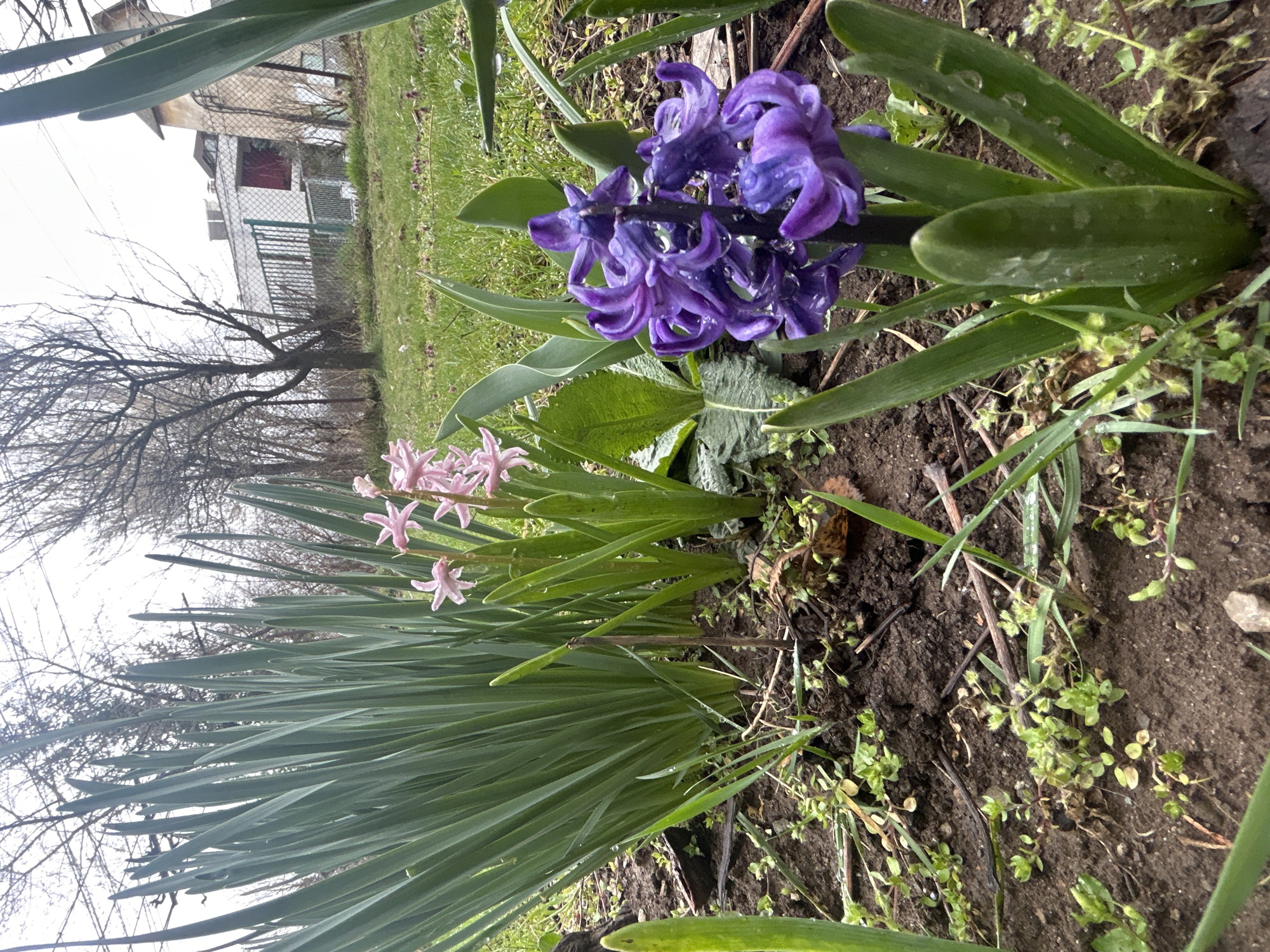 The scene depicts a garden in Lozen, Bulgaria, viewed from a low angle, focusing on flowering plants and ground cover. In the immediate foreground, dark, moist soil is visible, interspersed with small green weeds and fallen organic debris. To the right, a cluster of mature purple hyacinth flowers with numerous individual florets is prominent, exhibiting visible water droplets on both petals and broad green leaves. To the left of the purple hyacinth, a less distinct group of pink hyacinth flowers is present, also showing water droplets. Further left and behind these, a dense cluster of tall, slender, vibrant green leaves, consistent with daffodil or similar bulb foliage, rises vertically. The middle ground features a patch of green grass extending horizontally. Behind the foliage, a metal fence, possibly chain-link, is visible, separating the immediate garden area from the background. Numerous bare deciduous tree branches are visible through and above the fence, suggesting an early spring season or deciduous forest line. In the background, a light-colored building, likely a residence, is partially visible above the fence line. It features an upper section with a distinctive, pointed architectural element or chimney structure on its right side. A dark red element, possibly a door or window, is also discernible on the building's facade. The sky above is overcast, providing diffuse light to the scene. No individuals or active subjects are present.
