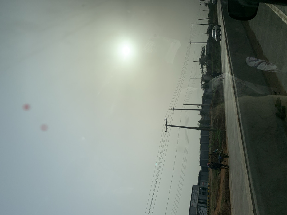 Hazy daylight obscures the view from inside a vehicle, showing a roadside scene. Power lines stretch along the right side of the road, next to overgrown grass and scattered trees. A building with signage stands near the road. A motorbike with two people on it is also seen parked along the road. A few cars are on the road further in the distance. The intense sunlight causes a strong glare.