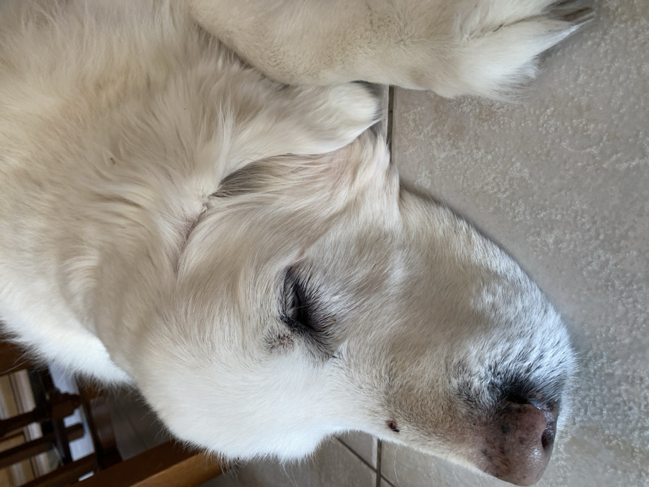 - "This image presents a close-up, elevated view of a light-furred domestic canid, likely a Golden Retriever, in a resting state within a residential environment located in Truchtersheim, France" by FM-3x3sP2, licensed under CC BY 4.0