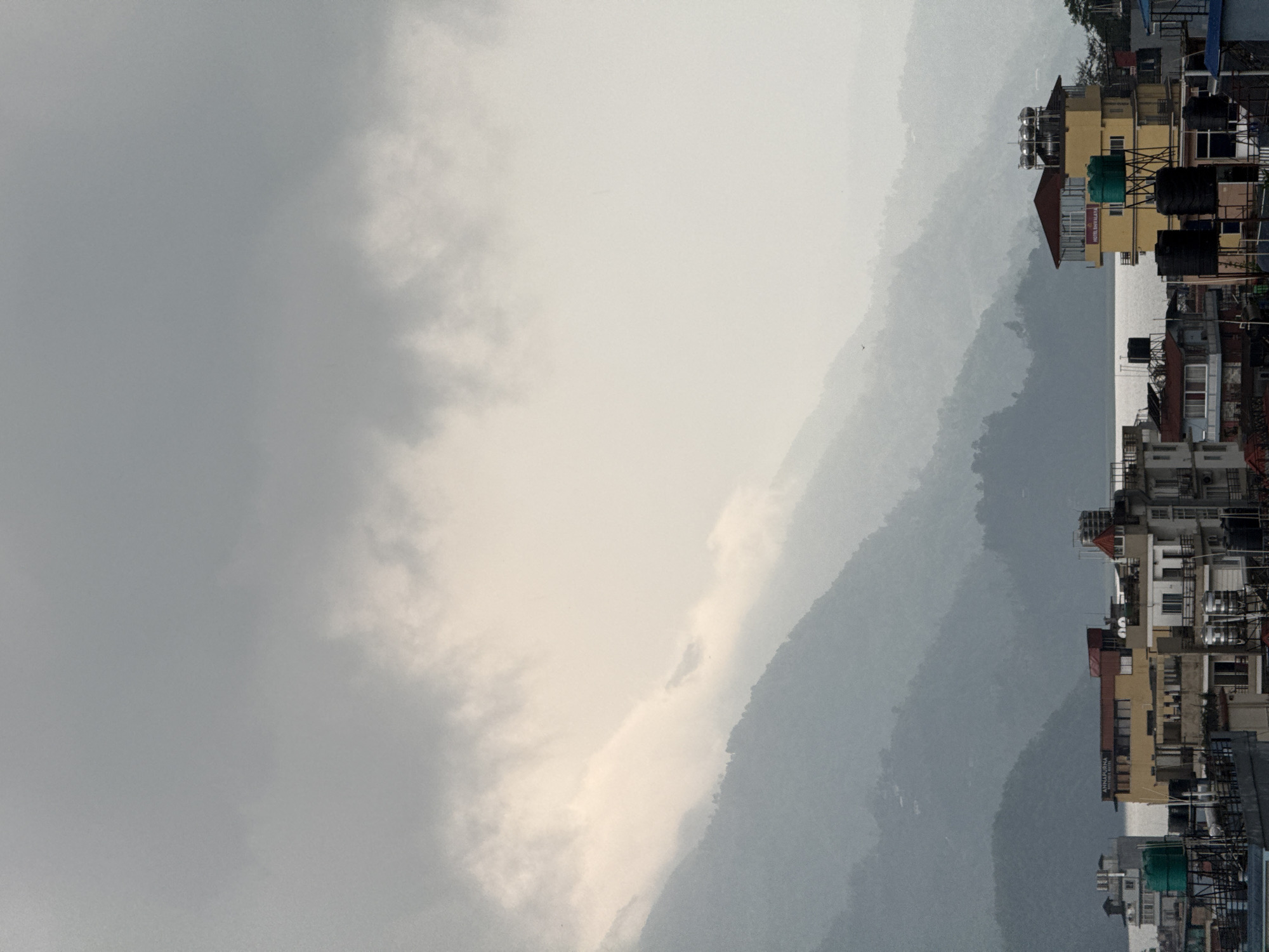 This is an outdoor shot from what appears to be Pokhara, Nepal. The photo depicts a cloudy and overcast sky covering a mountain range. In the foreground, buildings, some with water tanks on their roofs, are visible. The buildings vary in color from beige to white. One building prominently displays the word "Annapurna". The overall environment suggests a city nestled near mountainous terrain.