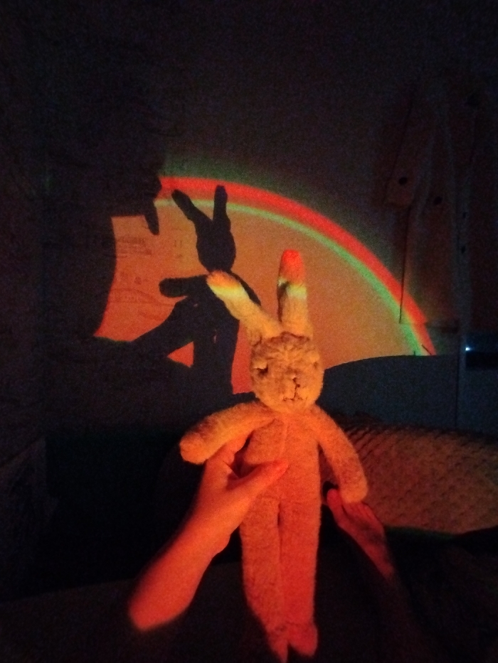 A stuffed rabbit doll is held up against a wall illuminated by a rainbow light