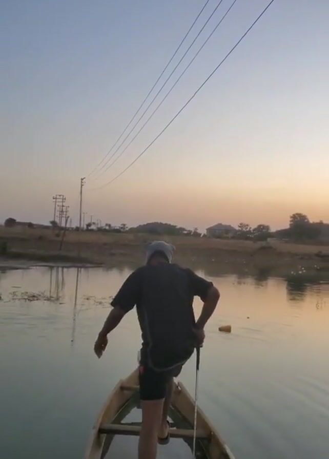 A man in a black shirt and shorts is standing in a narrow wooden boat on a calm body of water, possibly a lake or wide river