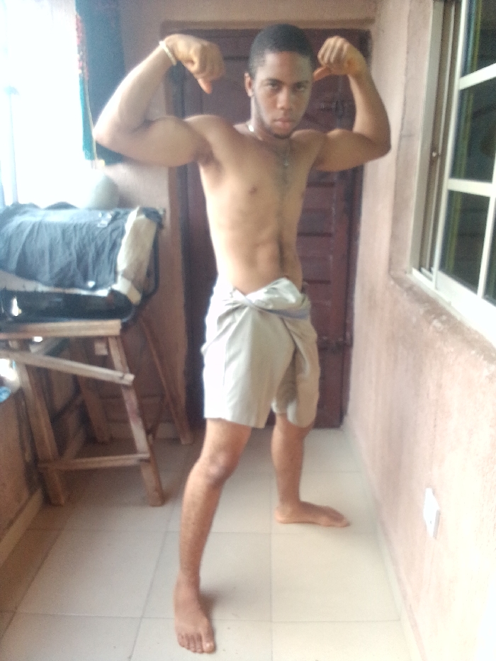This image displays a young adult male, presumably in Onitsha, Nigeria, standing centrally within what appears to be an indoor or semi-enclosed space