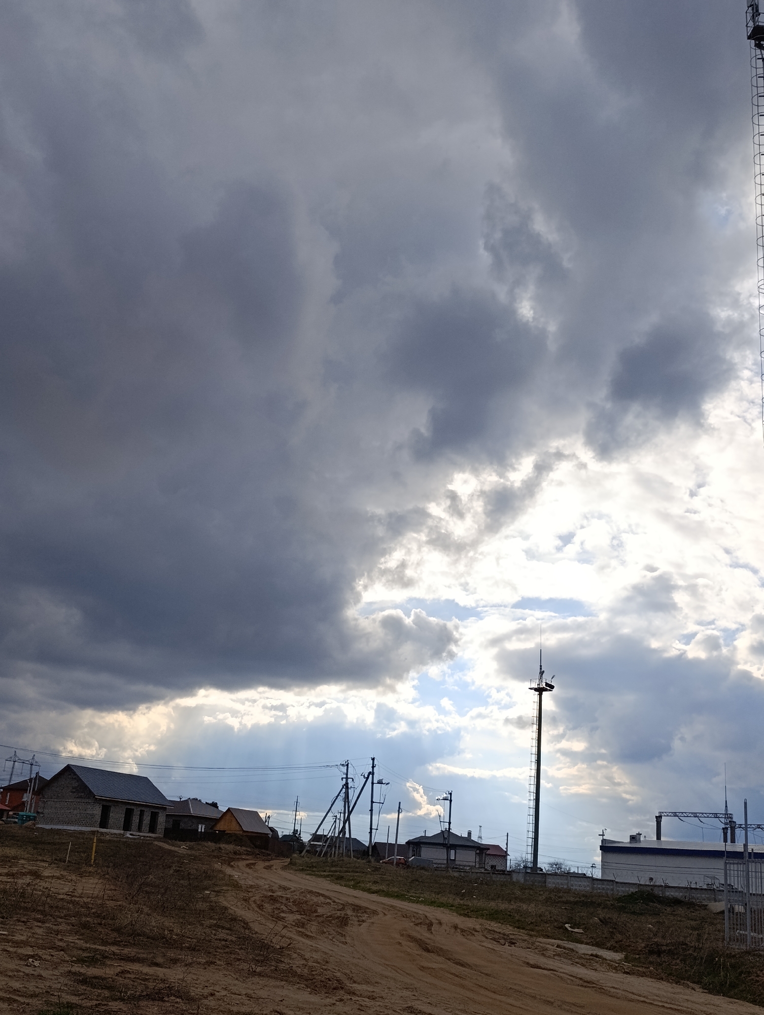 The image depicts a rural area near the city of Chaikovsky, Russia, under a cloudy sky. Predominantly gray and white clouds dominate the sky, with patches of blue visible through breaks in the cloud cover. Sunlight filters through the clouds, creating visible rays. In the foreground, a dirt road traverses a barren landscape. To the left of the road are several houses, some of which appear to be under construction. Power lines and utility poles run parallel to the road, leading towards a substation or industrial building on the right side of the image. A tall communication tower stands amidst these structures. The foreground is mainly dirt and sparsely covered with vegetation.