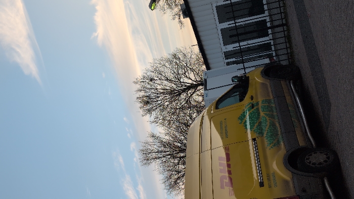 The image displays an outdoor scene in Venray, Netherlands, featuring the left side of a yellow DHL delivery van parked on a dark paved surface. The van bears the red and black "DHL" logo and a green tree graphic on its side, along with text including "NATUURLIJK ONDERWEG." Silver tubular side steps are installed below the vehicle's doors, and dark wheels are visible. In the background, several bare deciduous trees with visible nests are present under a light blue sky with scattered white and faint orange-pink wispy clouds. To the right of the van, a white modular structure stands next to a white building with multiple dark-framed windows or doors, fronted by a black metal fence. A streetlamp emitting a green light is visible on the far right. No individuals are present in the scene.