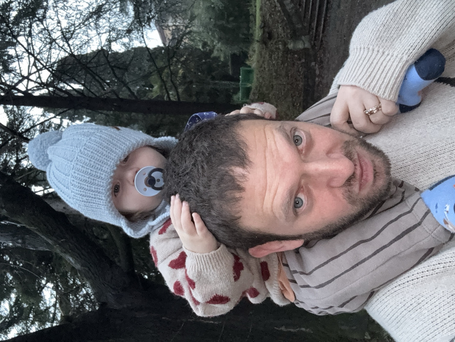 A man takes a selfie with a baby, seemingly outdoors. The baby, wearing a blue knitted hat, clutches the man's head, a pacifier in their mouth. The man, with a beard and light eyes, looks directly at the camera. He's wearing a striped shirt and a sweater, and a ring is visible on his finger. They're positioned against a backdrop of trees and foliage. The image is slightly tilted, adding a casual, candid feel.