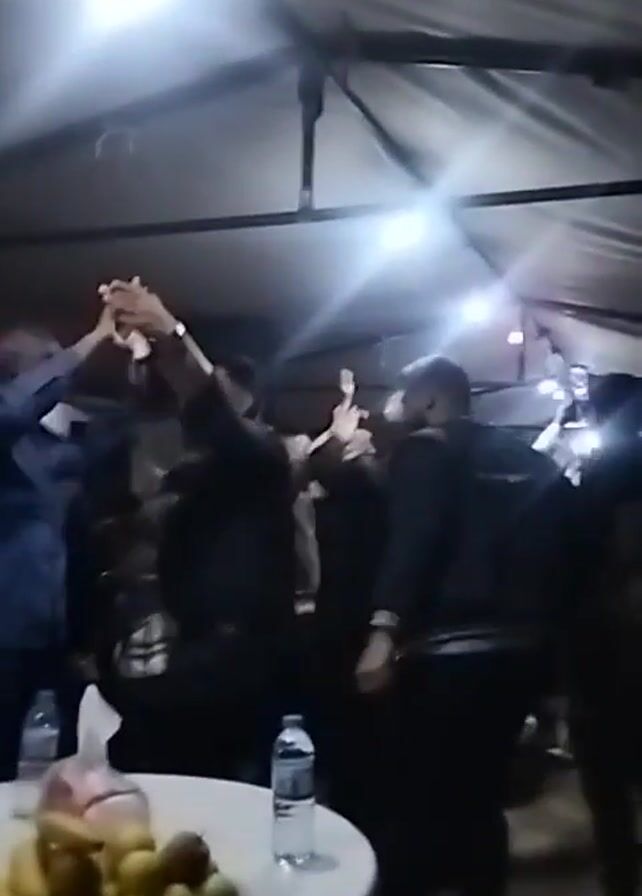 A dimly lit indoor gathering takes place beneath a white, tent-like structure. Multiple people, primarily men, are visible. They are raising their arms, some holding objects, in an apparent expression of celebration or group participation. Most are dressed in casual dark clothing, with one man in a blue shirt prominently positioned. A table in the foreground is covered with a white cloth and holds items including bottles of water, fruit, and a pink container. Lighting fixtures attached to the tent frame provide illumination, though the overall atmosphere remains dim. The focus is on the interaction of the individuals and their collective activity within the event.