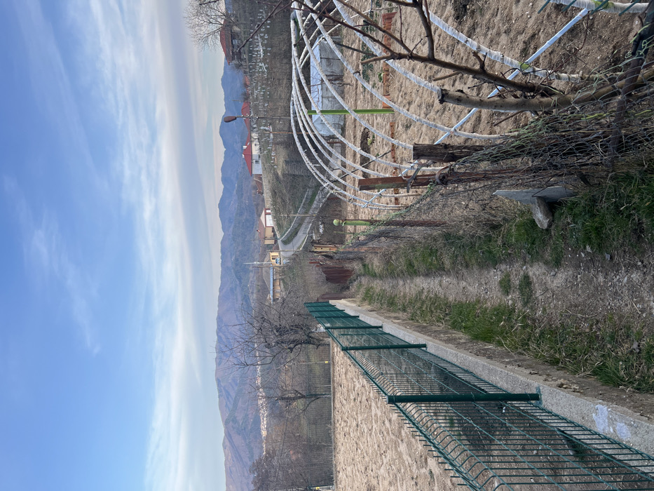 This image depicts a rural residential landscape in Sedlartsi, Bulgaria, viewed from a slightly elevated position. A narrow, unpaved dirt path, approximately 1.5 meters wide, traverses the foreground and midground, running uphill between two fences. To the immediate left of the path, a newly installed dark-green welded wire mesh fence rests on a concrete retaining wall, bordering a large, fallow agricultural or garden plot of exposed light-brown soil. To the immediate right of the path, an older, dilapidated fence made of rusty wire mesh and weathered wooden posts separates the path from another garden area. This area contains the skeletal framework of a greenhouse, constructed from multiple white plastic-covered hoops. Bare, dormant tree branches are visible along the right edge of the frame. In the midground, the dirt path appears to merge with or run alongside a paved asphalt road that curves through a cluster of residential buildings. These structures feature light-colored walls and red-tiled roofs. A streetlamp is positioned near the road. A hillside to the right of the road is dotted with numerous white markers, consistent with a cemetery. A distant white structure, possibly a minaret, is visible to the left of the road. Numerous bare deciduous trees are scattered throughout the midground. The background is dominated by a prominent range of undulating, forested mountains, which appear in various shades of blue and purple under a sky that is predominantly clear blue with scattered wisps of white cirrus clouds. No individuals or active subjects are present in the scene. The overall impression is of late winter or early spring due to the bare trees and dormant vegetation.