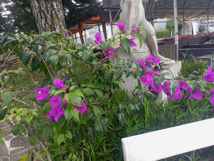 This image, taken in Cipanas, Indonesia, displays a vibrant outdoor scene dominated by a flowering bougainvillea plant. In the midground, numerous clusters of bright purplish-pink bracts, some featuring small yellow true flowers, and dark green leaves are prominent. To the immediate right of the bougainvillea, a weathered, light-colored stone or concrete statue, depicting the lower torso and legs of a human figure, stands on a plinth. Partially visible in the lower right foreground is a segment of a white, rectangular structure, likely a bench or railing. The background on the left features the rough, textured bark of a large tree trunk. To the right, beyond the statue, are various green plants and grasses. Further in the distance, partially obscured by foliage, are several utilitarian structures with metal framing and roofing, suggesting an outdoor facility. The overall lighting indicates an overcast or diffused daylight condition. No people are visible.