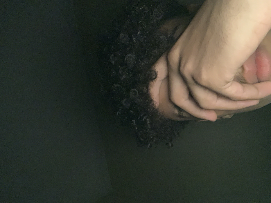 The image depicts a close-up, dimly lit portrait of an individual, likely taken indoors in Casablanca, Morocco. The subject is partially visible from the forehead to the mouth, positioned against a dark, featureless background. The individual has dark, tightly curled hair and a medium skin tone. Their right hand is raised, with fingers slightly splayed, covering the upper portion of their face, including the eyes and nose. The lower part of the face, including the mouth and a faint mustache, is visible beneath the hand. The overall lighting is low, contributing to a somber or obscured appearance.