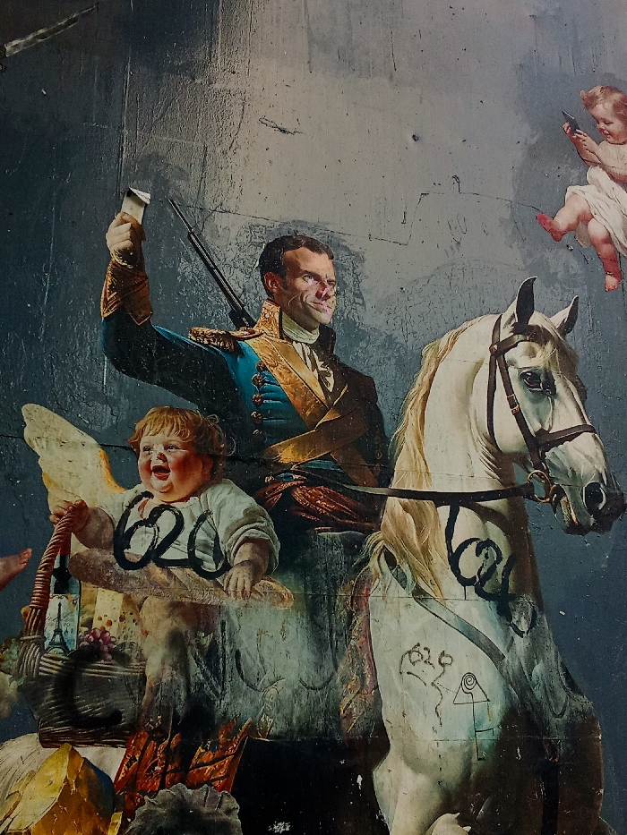 A weathered mural or large-format collage on a textured wall in Santiago, Chile, depicts a modified classical equestrian portrait. The central figure, identified by the superimposed face of French President Emmanuel Macron, wears a blue and gold military uniform atop a white horse. Macron's right arm is raised, holding a silver-backed smartphone. A rifle is visible on his back. To the upper right, a small, red-winged cherub holds a dark smartphone. To the lower left, a larger, off-white winged cherub, wearing a white shirt marked with "620" in black, carries a wicker basket filled with a wine bottle featuring an Eiffel Tower, a baguette, grapes, and cheese. Additional black graffiti marks are present on the horse's flank and other areas of the artwork.