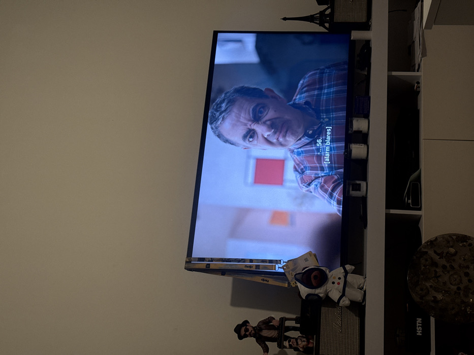 A television displays a scene with actor Rowan Atkinson, wearing a red and blue checkered shirt. Subtitles are visible. The TV is positioned on a white shelf unit with an Eiffel Tower figurine. Also on the shelf are a toy astronaut, a figure with a hat and sunglasses, a Marshall amplifier, and a decorative bowl. The wall is a light beige color.