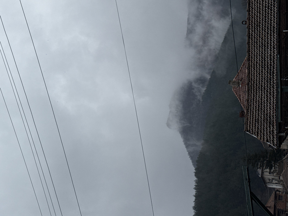 The image depicts a mountainous landscape in Zgorigrad, Bulgaria, under an overcast and foggy sky. The upper third of the frame is dominated by a uniform light grey sky, traversed by multiple dark, thin utility lines running diagonally from the upper left to the lower right. The mid-ground features a dark green, densely forested mountain range. The upper slopes and a prominent rocky peak towards the left are partially obscured by thick white-grey fog and low-hanging clouds, which lend a muted, indistinct quality to the terrain. A faint, cross-like structure is discernible atop the highest visible peak, partially enveloped by the mist. In the lower third of the image, a section of a settlement is visible. The most prominent feature is a terracotta-tiled hip roof with a central brick chimney, occupying the lower-right and center of the frame. The tiles display wear and varied reddish-brown tones. To the left of this roof, parts of other residential buildings are visible, including one with light-colored walls and dark window frames. A dark, metallic angled support structure, possibly part of a utility pole or overhead line infrastructure, is present in the lower-left corner. No people, specific actions, or interactions are visible in the scene. The overall environment conveys a cold, damp atmosphere typical of a mountainous region on an overcast day.