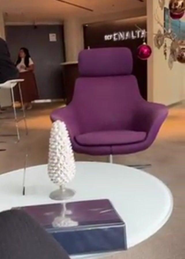 The camera pans slowly to the right in a waiting room. In the foreground is a small, white, round table with a decorative silver Christmas tree and a closed, dark-blue box on top of it. Behind the table, there is a purple, high-backed chair. To the upper right of the chair, there is a decorative tree branch in a gray pot with pink Christmas ornaments. In the background to the left, there is a counter with a person sitting at a bar stool. Another person wearing a brown skirt walks towards the counter. At the far back of the waiting room, the wall reads "BCF ENALTA".
