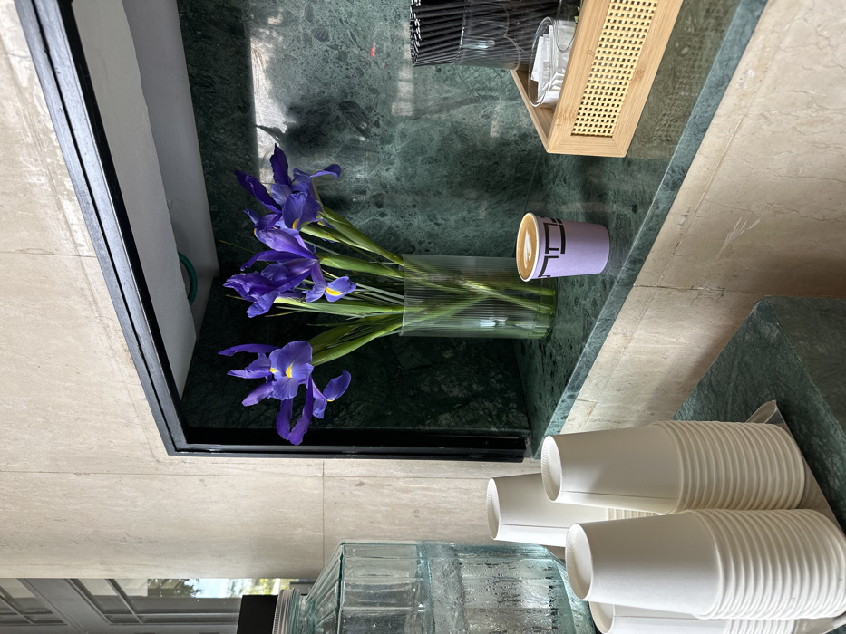 The image displays an interior scene, likely a self-service beverage station within a commercial or public building in Tel-Aviv, Israel. The station features a polished dark green marble countertop and a recessed alcove with a matching green marble back panel. Adjacent wall surfaces are composed of light beige, possibly travertine, stone or tile. A black trim frames the opening of the alcove. Within the green marble alcove, a clear, fluted glass vase holds a bouquet of several vibrant purple irises, each with a distinct yellow accent at its center. To the right of the vase, on the green marble countertop, a light purple paper cup is present. This cup features a black geometric logo, resembling the Hebrew letters "תל", and contains a beverage topped with white latte art in a heart or leaf design. To the left of the central arrangement, a large, clear glass water dispenser, visibly full of water with condensation on its exterior, stands on the green marble. Next to the dispenser are two vertically stacked groups of white, ridged paper cups, resting on a transparent tray. To the far right, a rectangular light-brown wooden tray with a woven rattan side contains a clear plastic insert, holding numerous black stir sticks or straws and several small white packets, presumably sugar or sweeteners. A window with a grid pattern is partially visible on the far left, allowing external light into the space. No individuals are depicted in the scene.