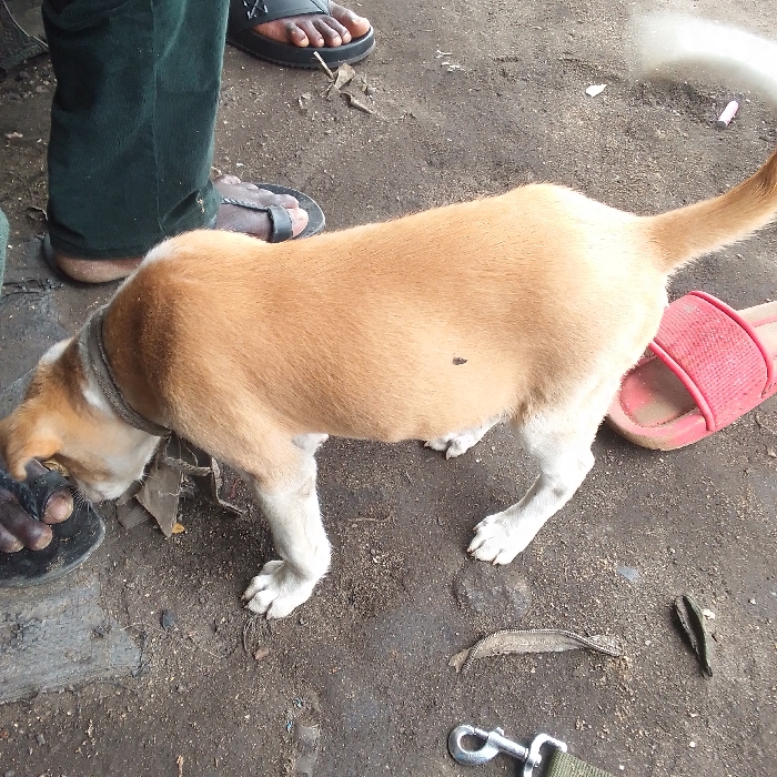 - "A light brown and white dog, wearing a collar, is depicted from a side view, actively sniffing the ground directly adjacent to a person's left foot" by FM-MrJfz1, licensed under CC BY 4.0