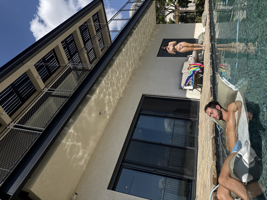 This image depicts an outdoor residential scene in Mevoot HaHermon Regional Council, Israel, featuring a modern building, a swimming pool, and two individuals on a clear, sunny day. In the foreground, a male subject with short dark hair and a beard is observed lying on a grey and olive green inflatable mat in a swimming pool. He is shirtless, wearing light blue swimming trunks, and appears to be resting with his eyes closed. The pool water is clear, and the bottom is tiled in a dark color, creating light reflections on the adjacent building facade. On the stone-tiled patio surrounding the pool, a female subject stands to the right. She has dark hair and is wearing a patterned two-piece bikini. Both hands are holding a smartphone positioned in front of her, suggesting she is taking a photograph or video. Behind her, a light grey outdoor sofa with cushions is placed on the patio. A small folding table next to the sofa holds a white water bottle and a multi-colored striped towel. An additional grey cushion rests on the patio floor near the female. The background features a two-story modern building with a light beige stucco exterior. The ground floor has large black-framed sliding glass doors that reflect the sky and distant landscape. The second story includes a balcony with black structural elements and stainless steel mesh railings. Above the balcony, a flat roof structure incorporates dark, horizontal slats. A white dome security camera is mounted on the building's wall above the sliding doors. The sky is blue with scattered white clouds. Green foliage is visible on the right side of the image, behind the building structure.