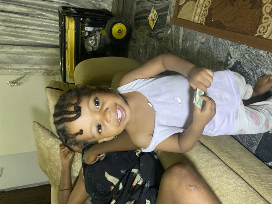 A young child with braided hair lies on a beige couch, holding what appears to be money. She is smiling at the camera. The child is wearing a light-colored tank top and patterned pants. An adult arm is visible behind her. In the background, a yellow generator sits near the edge of the couch, and a piece of paper is on a tiled floor near a brown rug. The scene appears to be indoors.