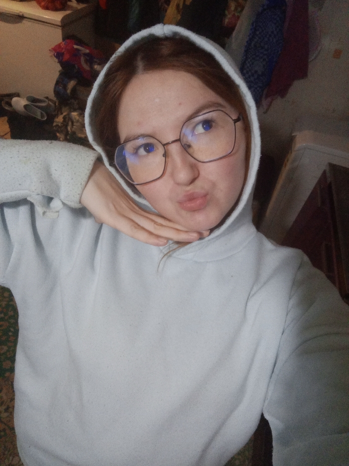 An individual with reddish-brown hair and fair skin is depicted in a close-up, indoor portrait. The subject wears a light grey hooded sweatshirt with the hood up and large, dark-framed, possibly hexagonal glasses, reflecting blue light in the lenses. The subject's lips are pursed into a pout, and the right hand is positioned under the chin. The gaze is directed upwards and to the right. The background shows an indoor environment featuring a patterned rug in the lower left, a pile of various fabrics or clothing items, and a pair of light-colored slippers in the upper left, and dark wooden furniture to the right. The specified location for this scene is Старый Шагирт, Russia.