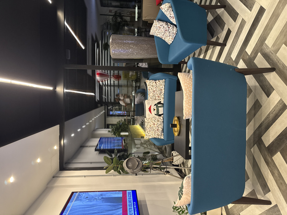 The interior space features blue modern seating, including a long sofa and an armchair, adorned with patterned pillows