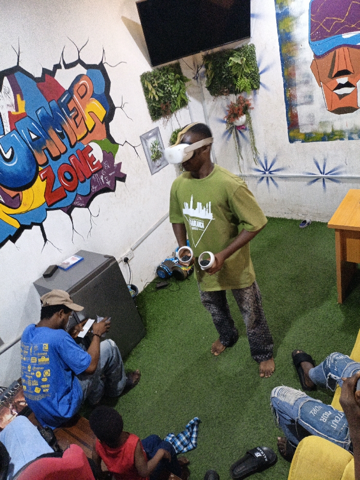 The scene depicts an indoor gaming facility in Adankolo, Nigeria