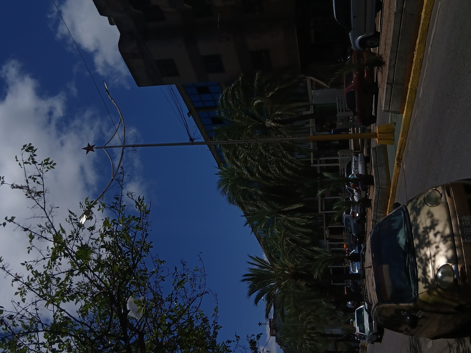 The image captures a street scene in Juan Griego, Venezuela. Dominating the right side of the image is a line of parked cars along the curb, including a dark, older model vehicle in the foreground. Across the street, palm trees line the sidewalk in front of a building with multiple windows. A tall, metal street lamp stands out, with a five-pointed star adorning its top. A tree with foliage is visible on the left side of the frame. The sky is a mix of clear blue and scattered white clouds.