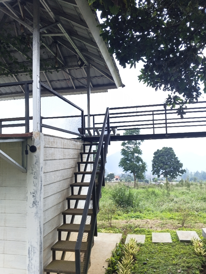 The image depicts a multi-level outdoor structure located in Man Gyat, Myanmar, under an overcast sky. In the foreground, a black metal staircase with approximately ten visible steps and an open riser design ascends towards an elevated platform. The staircase features black metal handrails with horizontal bars. To the left of the staircase, a white building wall with horizontal paneling is visible, featuring a black cylindrical light fixture mounted on its exterior. Above the first level, a metal-framed structure supports a slanted, corrugated metal roof. An elevated walkway or balcony, enclosed by black metal railings similar to the staircase, extends from the platform. The immediate ground area features a manicured lawn with square concrete stepping stones leading away from the staircase base, flanked by striped green and yellow foliage. The midground reveals a natural landscape dominated by green grass and scattered bushes. Two prominent deciduous trees with full green canopies stand in the center-right. In the distant background, hazy green mountains or hills are visible beneath the cloudy sky, with hints of other structures in the far-off terrain. No individuals or animals are present in the scene.