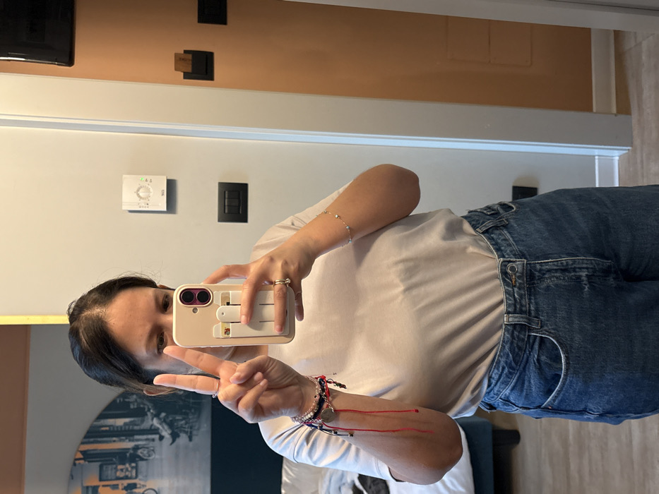 A female individual is depicted indoors, capturing a mirror selfie within what appears to be a hotel room in Bologna, Italy. She holds a light-colored smartphone with a white cardholder attachment in her left hand, while her right hand is raised, forming a V-sign. She has dark hair pulled back and is dressed in a light-colored short-sleeved t-shirt and blue denim jeans. Her left wrist is adorned with multiple bracelets, including red strings, and rings are visible on her left thumb and ring finger. A delicate beaded bracelet is on her right wrist. The immediate background behind the subject reveals a light grey wall. Mounted on this wall is a white thermostat with a visible rotary dial and a green indicator light, below which is a horizontal black triple light switch panel. To the right, a white door frame separates the light grey wall from a warm terracotta-colored wall section. On the terracotta wall, a black wall-mounted key card holder and a single black light switch are visible. A portion of a bed with a dark blue headboard and white bedding is visible in the reflection on the far left. Above the bed, a large arched framed print depicting an old-world street scene is visible.
