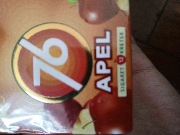 product labeled "76 APEL", with "APEL" being a prominent text. The product seems to be associated with apples, as evidenced by apple imagery surrounding the text. Additionally, the words "SIGARET 12 KRETEK" are also visible, suggesting the product is related to cigarettes, possibly clove cigarettes. The logo of "76" is in white and placed on a golden-colored gradient. The packaging has a warm, orange-toned color scheme.