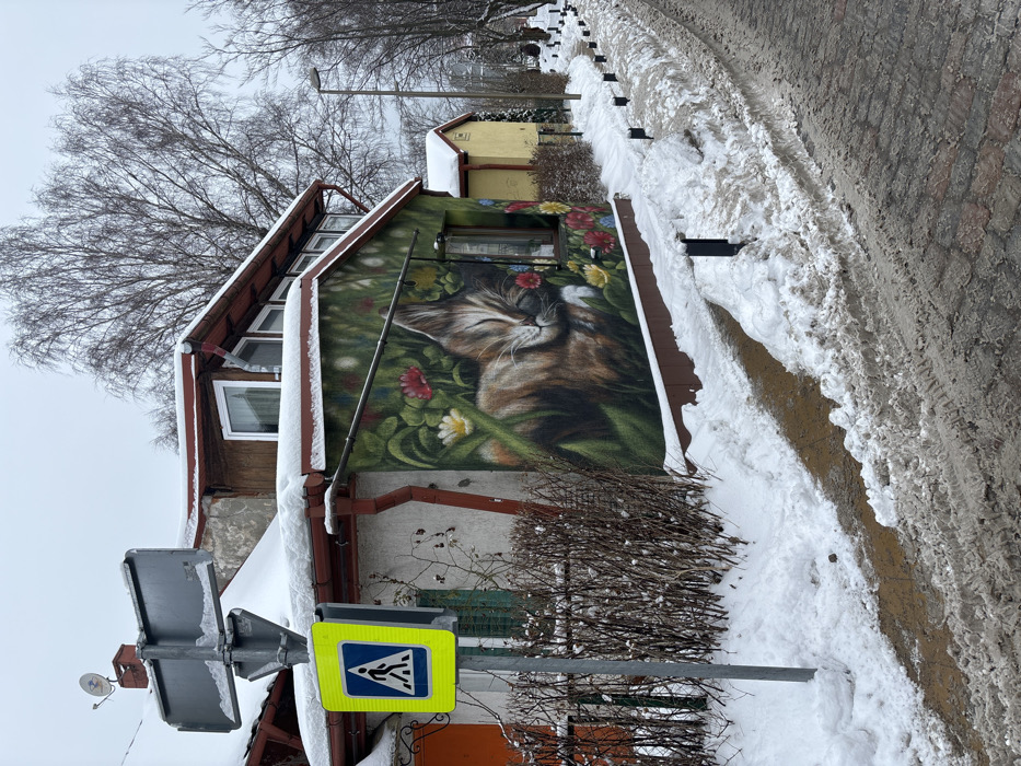 This image depicts a snow-covered street scene in Zelenogradsk, Russia, on an overcast winter day. In the foreground, a yellow square pedestrian crossing sign with a blue border and white figure is mounted on a gray metal pole, positioned to the left. The pole also supports a larger, blank rectangular sign facing away from the viewer. To the right of the sign, a two-story building with a red-brown roof heavily laden with snow is prominent. Its ground floor exterior features a large, detailed mural of a sleeping brown and white cat nestled among green foliage and colorful flowers, including red, yellow, and white blossoms. A small window is integrated into the mural on the right side of the wall. The building's upper story has multiple white-framed windows, and a red downspout is visible on the left side of the wall. The lower portion of the building's facade below the mural is trimmed with dark brown paneling. To the left of the mural, the wall appears to be light-colored stucco, and part of an orange door is partially visible. Bare, brown bushes with residual snow are located between the street sign pole and the building. Adjacent to the building, a narrow, cleared pedestrian path of brown earth cuts through accumulated snow. This path is bordered by several black, short bollard-like structures. The main street, visible to the right, is a cobblestone surface partially covered in dirty, compacted snow and slush, showing tire tracks. Further down the street on the right, a smaller, single-story yellow building with a dark roof and snow accumulation is present. A tall, bare deciduous tree stands in the background against the muted sky, and a street light pole is also visible on the right side of the street, extending into the distance where more bare trees line the roadside.
