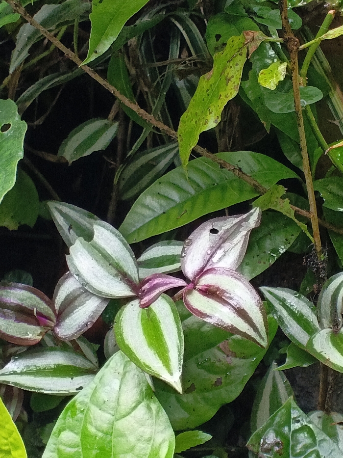 Lush foliage fills the frame, featuring diverse green leaves. Striking among them are the striped leaves of a Tradescantia zebrina plant, exhibiting silver and dark green bands with hints of purple. Some leaves have noticeable holes. Water droplets glisten on the surfaces. A few bare branches weave through the foliage, adding texture to the composition.