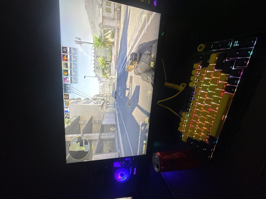 The image depicts a personal computer gaming setup located in Sofia, Bulgaria. The primary focus is a monitor displaying a first-person perspective of the video game Counter-Strike 2, specifically on the "Dust II" map, with the player positioned at "T Start." The in-game display shows a Glick pistol in the player's gloved hand, a minimap in the upper left, player avatars and scores in the upper center, and a "Warmup Ending 0:04" timer at the bottom center. To the left of the monitor, a PC tower is partially visible, emitting a purple/blue RGB light from an internal fan. On the desk in front of the monitor, a red Coca-Cola can is present to the left. A mechanical keyboard with yellow keycaps and vibrant multi-color RGB backlighting is positioned centrally on the desk. A yellow coiled USB cable connects the keyboard, extending towards the right. The overall environment is dimly lit, suggesting a dark room or a dedicated gaming space. No individuals are directly visible in the frame, but the setup implies an active player.