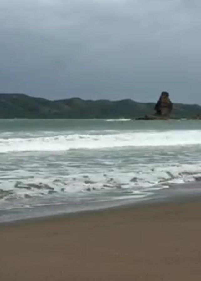 beach scene. The sand is dark and wet near the water's edge, transitioning to a lighter hue further inland. Waves, some breaking with noticeable force, roll towards the shore. The water is a greenish-gray color. In the background, a rocky outcrop or stack rises from the water, and behind that are rolling green hills under a heavy, overcast sky.