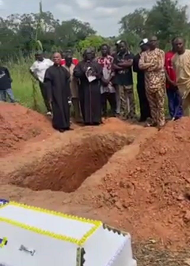 A funeral is taking place in an outdoor, natural setting. A group of people, predominantly men, are gathered around a dug grave. A white coffin decorated with yellow and blue accents rests on the ground near the grave. Some attendees are dressed in casual clothing, while others wear more formal attire. At least one person appears to be wearing clergy robes. The setting appears to be somewhat rural.
