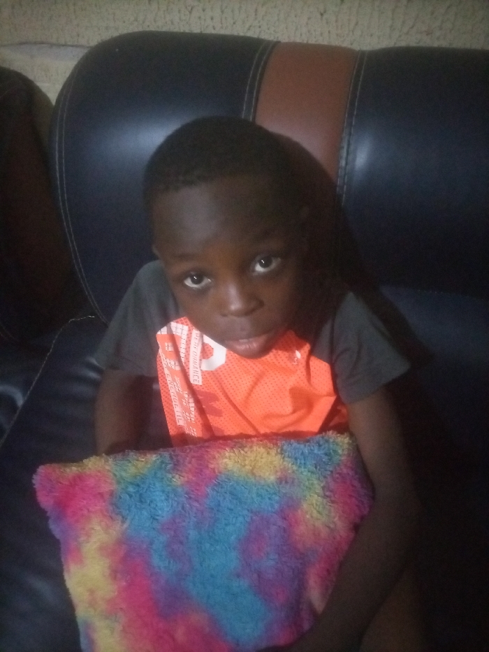 A young, dark-skinned child sits on a black leather couch. The child wears an orange jersey with gray sleeves. The child holds a brightly colored, fluffy pillow with pink, blue, yellow, and purple hues. The child looks directly at the camera with a solemn expression. The background is dimly lit.