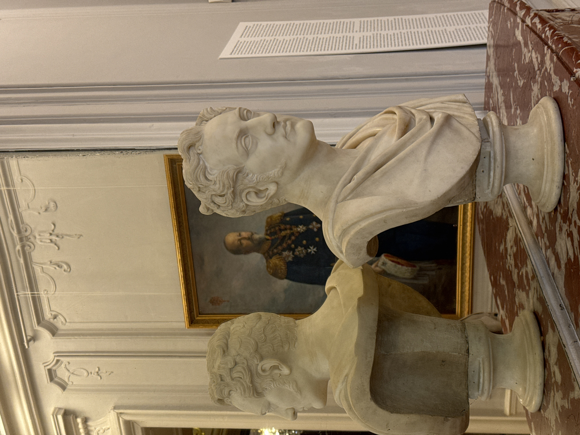 two marble busts on a red marble surface. One bust is in the foreground and the other is partially reflected in a mirror behind it. Behind the reflection is a painting of a man in military attire, framed in gold. The busts are depicted in a room with ornate white walls. The location is likely a museum or historical building in Sofia, Bulgaria.