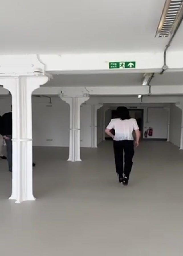 The video depicts a tour of a large, empty, white-painted room with numerous support columns. The initial shot shows a woman with dark hair and a white top, walking toward the back of the space. Several people in casual clothing are walking and talking near the back of the space. The camera then pans around the room, showing the columns and high ceilings. There are industrial style light fixtures and a fire extinguisher. A large set of blue doors with panes of glass are visible at the end of the room, providing a view of a body of water and a city skyline.