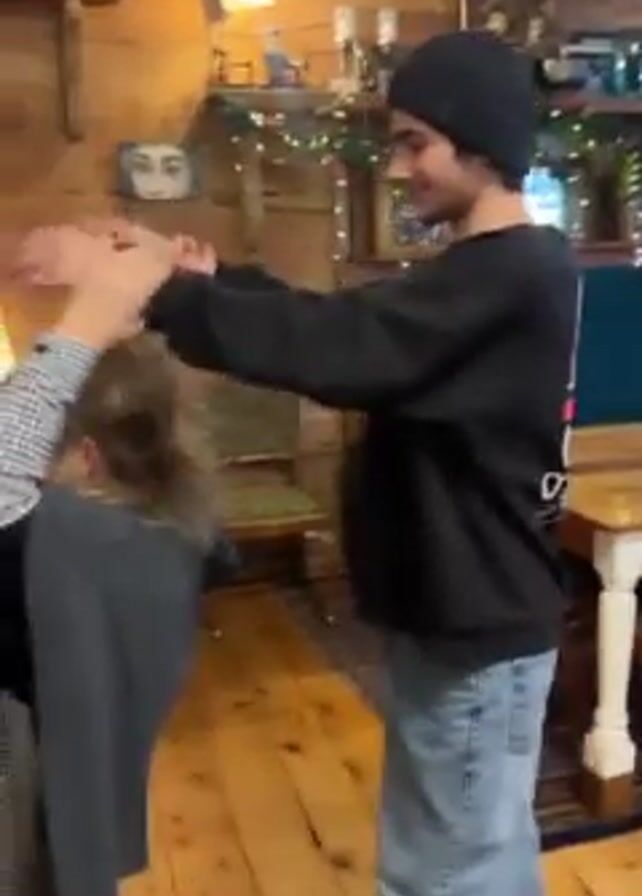 Inside a cozy, rustic-styled room with wood paneling, a young man in a black beanie and sweatshirt is standing behind a seated person with blond hair