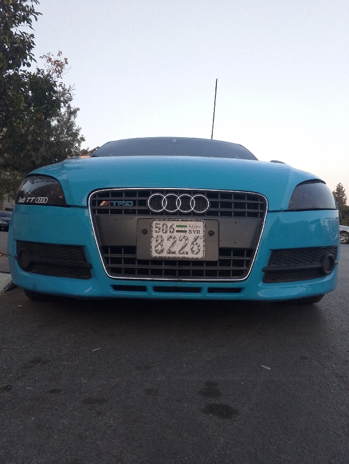 A turquoise Audi TT, seen front-on, occupies most of the frame. The car features a black grille, an Audi logo, and a Syrian license plate reading "506 SYR 8226". The headlights are tinted black. The car is parked on a dark asphalt surface. A tree with green leaves is visible on the left, and the sky is visible in the background.