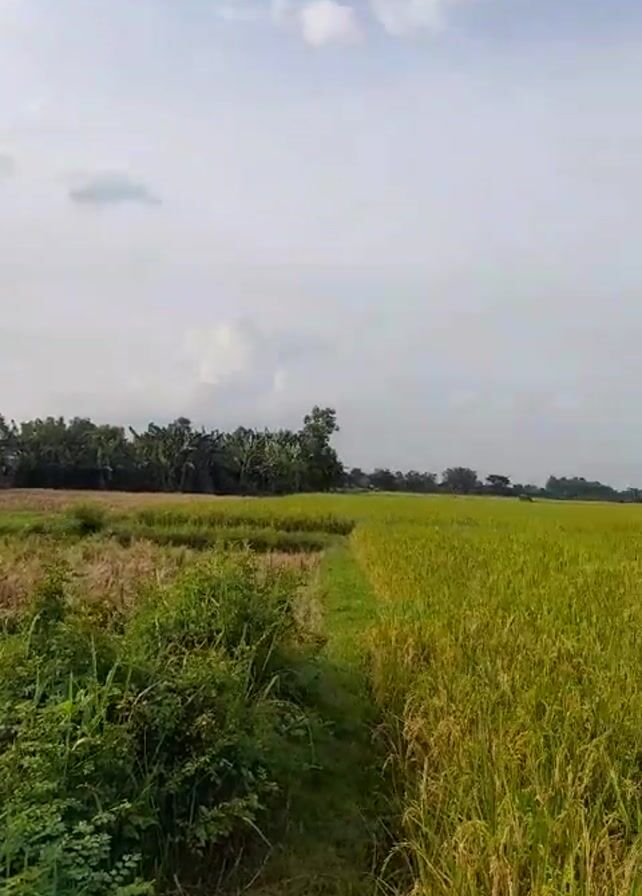 wide view of a lush paddy field, likely filled with rice crops nearing harvest as indicated by the golden hue