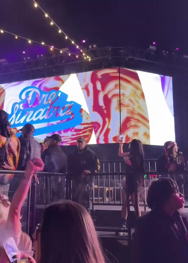 The scene depicts a music concert or festival at night. A large LED screen in the background displays the name "Dre Sinatra" in a stylized font over a swirling, psychedelic pattern. Below the screen, a crowd of people stands, some appearing to be on a raised platform or VIP section behind metal barriers. Several individuals in the crowd are actively engaging with the music, raising their hands and dancing. The lighting includes overhead string lights and stage lights, creating a vibrant and energetic atmosphere. The people in the foreground are dressed in various casual attires, capturing the youthful and lively energy of the event.