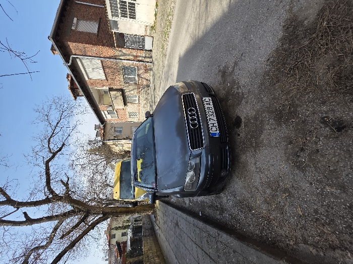 The scene depicts a street in a residential area of Plovdiv, Bulgaria, under a clear, sunny sky. A dark grey Audi A3 hatchback, bearing Bulgarian license plate CH 7328 AC, is parked in the foreground, facing the viewer. It rests on a dirt and gravel surface, which appears damp and exhibits dark stains beneath the vehicle. To its left, a paved sidewalk with a curb is visible. In the immediate background, a yellow utility van is parked. Across the street, to the right, stands an aged, two-story brick building featuring white window shutters, some closed, and a small balcony on the second floor. Further down the street, additional residential buildings with tiled roofs are visible. A large, leafless deciduous tree with extensive branches dominates the left side of the image, rooted behind the sidewalk. No individuals are present in the visible area.