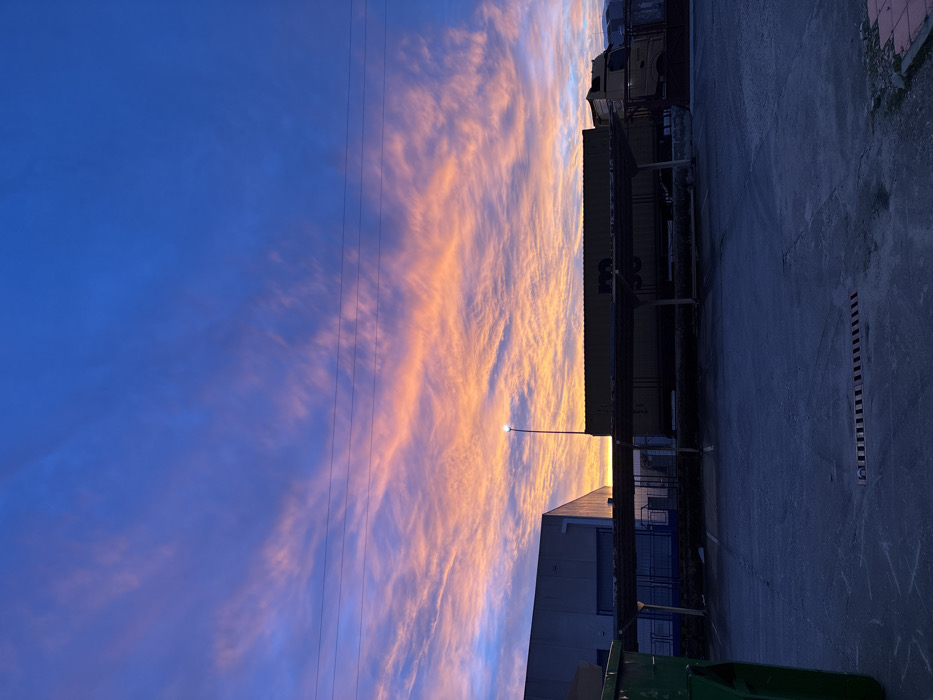 An exterior image depicts an industrial or commercial area in Valverde del Majano, Spain, at twilight. The sky transitions from deep blue overhead to vibrant orange and pink altocumulus clouds near the horizon. The foreground consists of a dark, empty asphalt or concrete parking lot with a rectangular metal drain grating present. A green commercial dumpster is partially visible on the far left. In the midground, a light-grey industrial building with a flat roof and a large recessed opening protected by blue grating is situated on the left. Centrally, a tall pole with an illuminated street lamp fixture stands. To the right of the lamp, a dark, low-lying canopy or covered structure extends horizontally, beneath which a yellow-tan cargo container with dark markings and parts of other industrial vehicles, including yellow-tan truck cabs, are visible. Multiple dark utility lines traverse the upper portion of the sky. No individuals are present in the scene.
