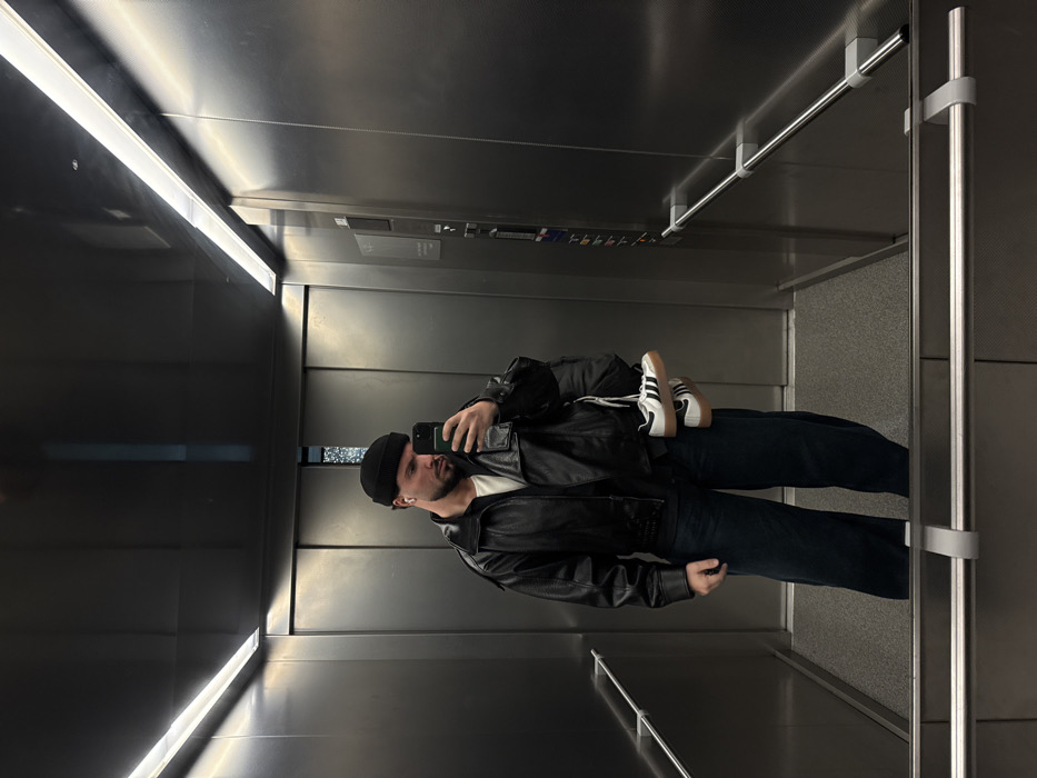 - "Inside a metal elevator, a person in a black beanie, leather jacket, and jeans takes a selfie with a smartphone" by FM-euyLP2, licensed under CC BY 4.0