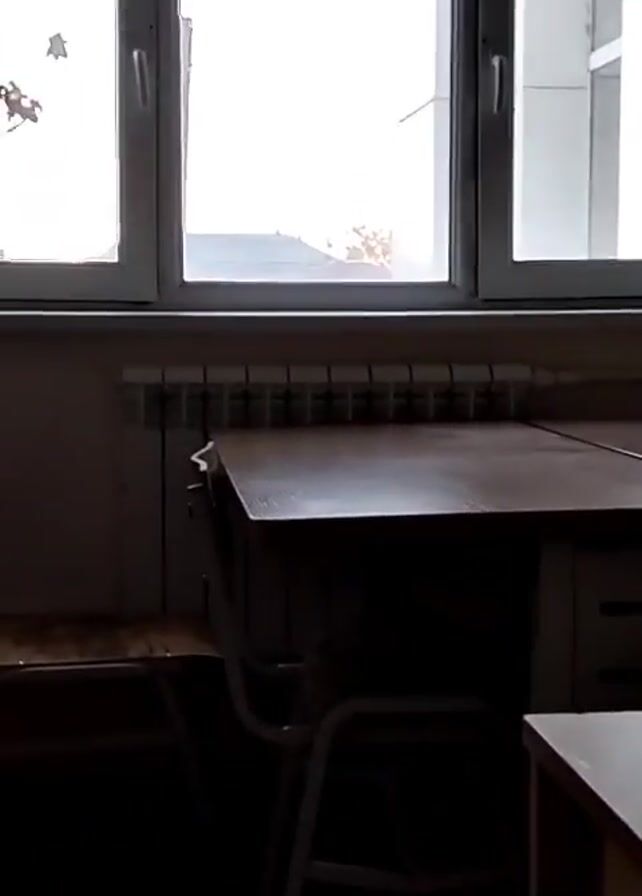 dimly lit room with a window in the background. The window is composed of three sections. Outside the window, a building with a gray roof and bare trees are visible against a light-colored sky, possibly indicating dawn or dusk. In the foreground, there are desks and chairs. A radiator is visible underneath the window. The room appears to be a classroom or office setting. The camera is still and there is no audio.
