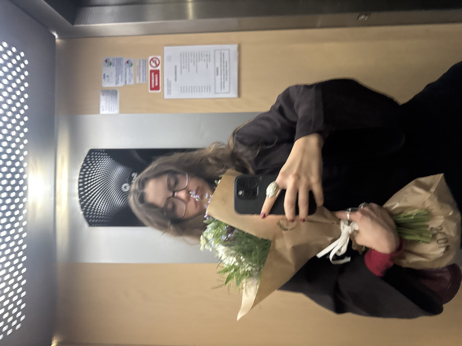 A young adult female is captured in a mirror selfie inside an elevator. She has medium-length wavy brown hair and wears clear-framed glasses. Her attire consists of a dark, long-sleeved garment, with a flash of red fabric visible on her left wrist. Red nail polish is present on her right hand. The subject is holding a bouquet of mixed flowers, including green foliage, white, and purple blooms, wrapped in brown paper and secured with a white string, to her nose, appearing to smell them. Her right hand holds a black smartphone with a multi-lens camera array, positioned to capture her reflection in the mirror. She wears a large, textured ring on the ring finger of her right hand, and additional rings on her left hand. The elevator interior features light brown/beige panels on the left and right walls, with a prominent mirror panel constituting the center back wall. The ceiling is a perforated metal grid with numerous circular lights. Reflected on the right beige panel are several white rectangular signs and one red sign. The red sign clearly displays "PROIBIDO FUMAR" (No Smoking) in Portuguese. Below it, a larger white sign provides detailed service information and a schedule, also in Portuguese. Above the no-smoking sign, smaller white signs feature logos for service providers such as OTIS, Schindler, MEO, and EDP. The scene is located within an elevator in the city of Oeiras, Portugal, a fact supported by the presence of Portuguese language on the official signage and the specific logos of companies operating in Portugal.