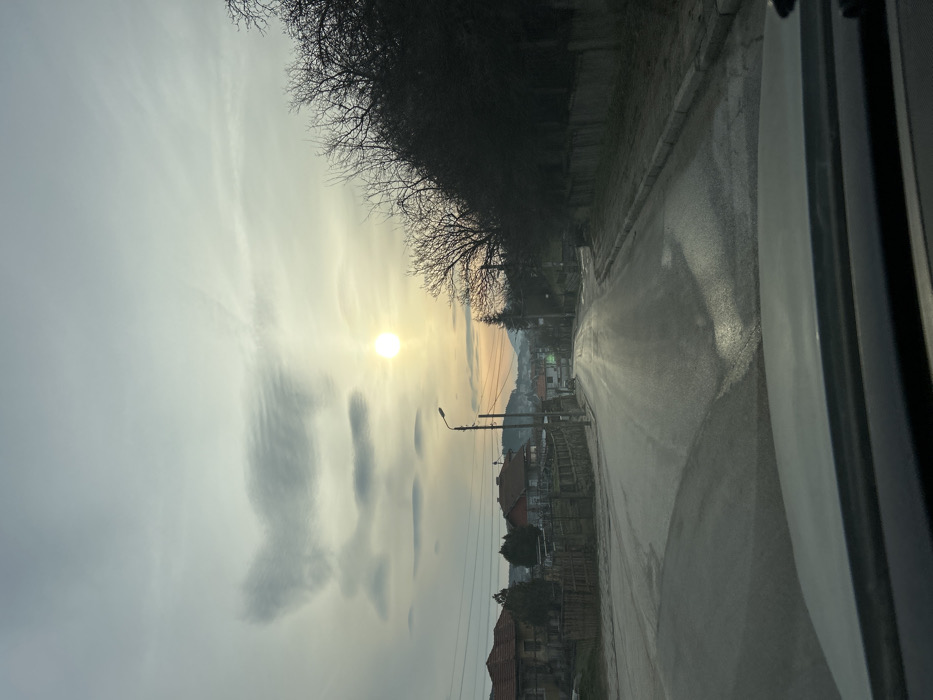 An outdoor scene in the city of Kalofer, Bulgaria, depicts a residential street at an indeterminate time, possibly sunrise or sunset, viewed from inside a vehicle. The asphalt road, appearing damp or reflective, extends downhill and slightly curves left into the distance. A distinct bright, circular sun is positioned low in the sky, slightly right of center, casting reflections on the road surface. The sky is largely overcast with scattered cloud formations, including a prominent elongated, horizontal cloud above the sun. On the left side of the road, several traditional houses with red-tiled roofs are visible behind fences, interspersed with utility poles and bare trees. On the right side, a line of dense, bare deciduous trees forms a dark mass, separated from the road by a curb and verge. Rolling hills or mountains are discernible on the distant horizon. The lower portion of the image shows the dashboard and windshield of the vehicle from which the photograph was taken. No individuals or active subjects are present in the scene.