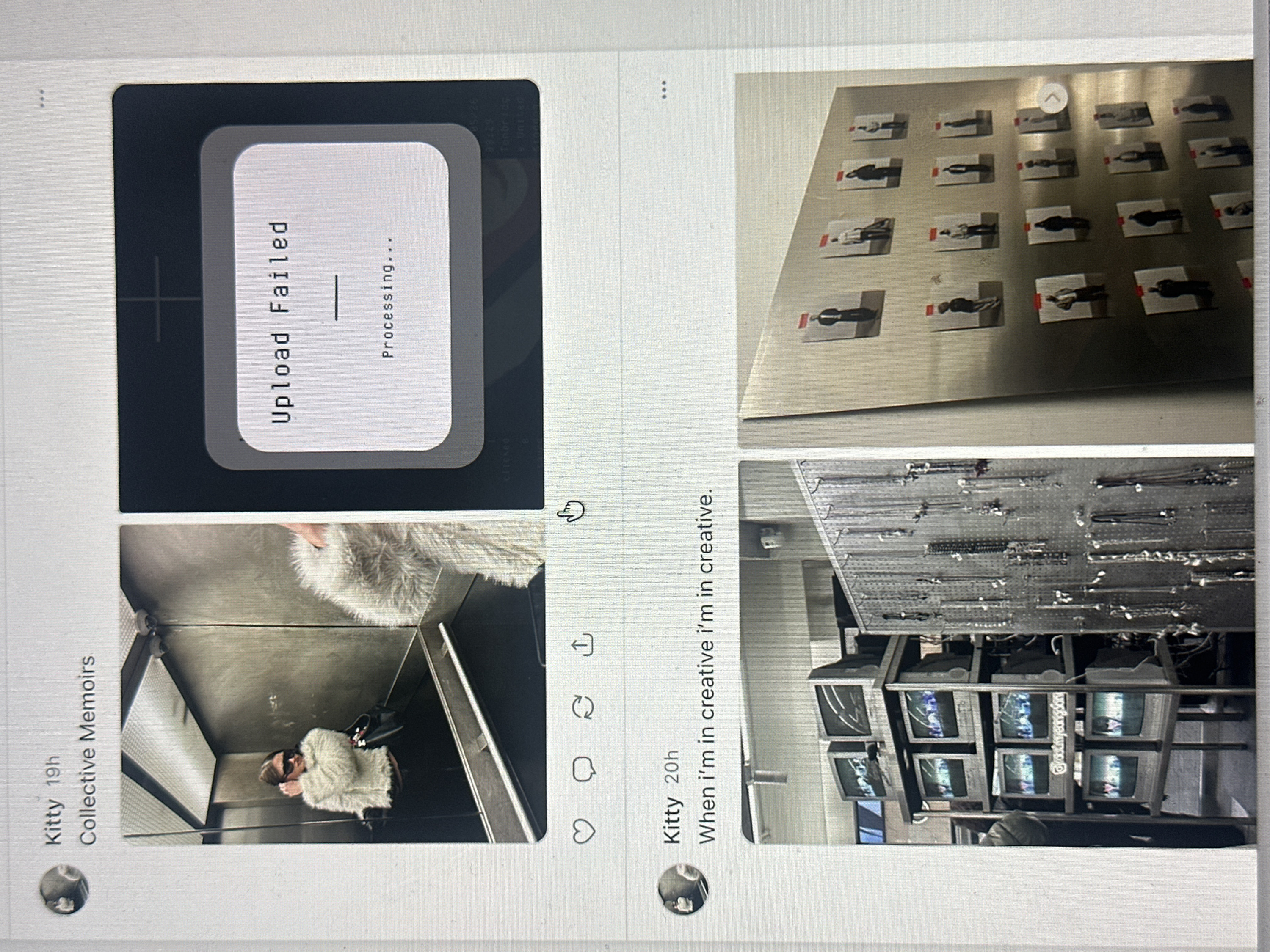 The image displays a screen showing two social media posts by a user named "Kitty." The top post, captioned "Collective Memoirs" and posted 19 hours prior, features two images. The first image depicts a female individual in a light-colored, shaggy jacket and dark sunglasses, reflected in a metallic elevator interior. She carries a black handbag on her left arm. The second image shows a digital interface with a "Upload Failed" pop-up over a "Processing..." message. Faint text below the pop-up indicates the location as **Tunbridge Wells, United Kingdom**, with a timestamp of "89:29". A hand-shaped cursor points towards this upload failure image. Below these images, social media interaction icons (like, comment, repost, share) are visible. The bottom post, captioned "When i'm in creative i'm in creative" and posted 20 hours prior, also features two images. The first shows an interior space containing a metal shelving unit with multiple stacked CRT televisions displaying abstract or distorted video content. To the right, a pegboard-style display holds numerous necklaces and chains. A person's lower body in dark attire is partially visible on the left. The second image displays a grid of approximately 18 small rectangular prints, each depicting a silhouette or outline of a person, affixed with red clips to a light-colored, possibly metallic wall. A right-pointing arrow icon suggests further images are available.