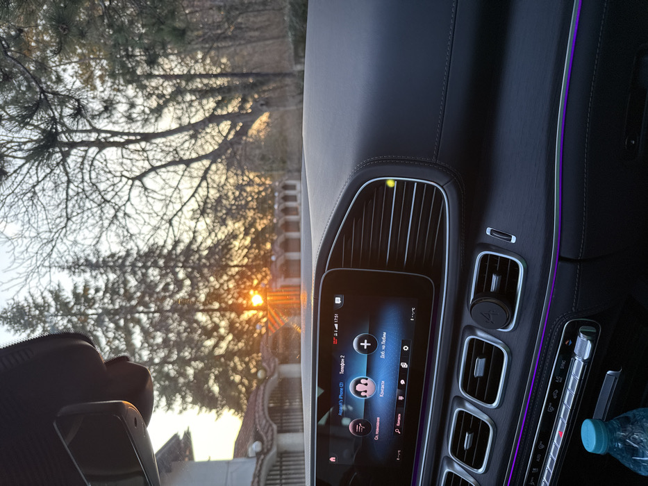 The image displays the interior of a vehicle, viewed from the front passenger side, looking forward through the windshield. The dark-toned dashboard features a large central infotainment screen exhibiting Bulgarian text, including options for "Asraph's iPhone (2)" and "Телефон 2", along with network indicators and the time "17:51". Below the screen are multiple horizontal air vents with chrome surrounds. A black, circular phone mount is attached to one of the central vents. A thin purple ambient light strip runs across the dashboard. A plastic water bottle with a blue cap is visible in a lower storage area. A yellow indicator light is illuminated on the far right air vent. A portion of the rearview mirror assembly is visible at the top. Through the windshield, a late afternoon or sunset scene is visible, characterized by the low sun casting an orange glow and generating lens flares in the center-left. The environment outside consists of numerous trees, a mix of bare deciduous trees and evergreen conifers. To the left, part of a building with a terracotta-tiled roof and a light-colored facade is visible, situated behind a decorative fence or low wall with multiple arched openings. A paved surface, consistent with a road or driveway, extends into the middle distance. This setting is indicative of a residential or semi-urban area, possibly near a green space or the outskirts of the city, within Pleven, Bulgaria. No specific landmarks are present to pinpoint an exact location within Pleven. No individuals are visible in the scene.