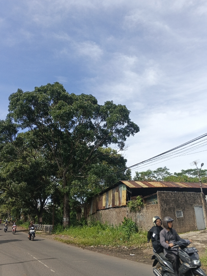 A bustling street scene unfolds under a partly cloudy sky. Motorcyclists traverse a road lined with lush greenery and a large, shady tree. Adjacent to the road, a weathered, single-story building with a rusted metal roof stands beside a concrete wall overgrown with plants. Overhead, power lines stretch across the sky, adding to the urban landscape.